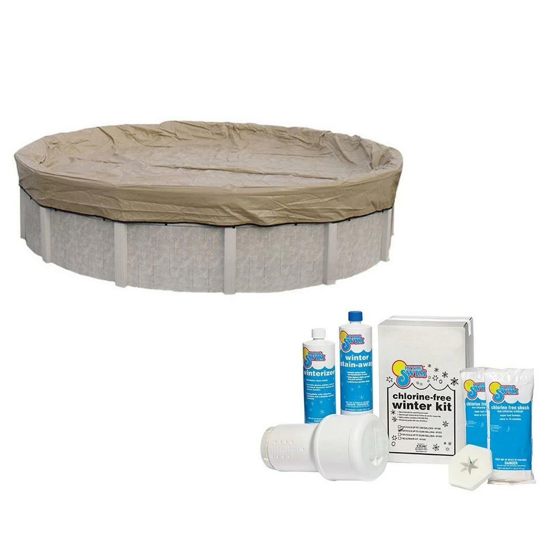 Polar Protector 20-Year 24′ Round Winter Pool Cover with Pool Closing Kit up to 15,000 Gallons Bundle includes winter pool cover for 24′ round above ground pool and pool closing chemical kit for pools up to 15,000 gallons.