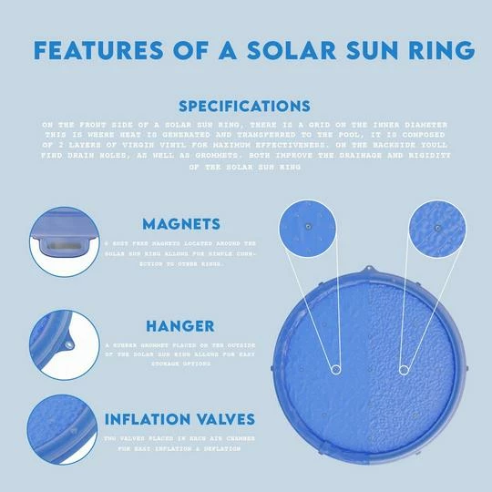At night the contained air acts as an insulating blanket to retain heat gained during daylight. Solar Sun Rings are equipped with six magnets to facilitate rafting. The strength of the magnets will permit single position removal but will easily separate to prevent entrapment in accidental falls. Solar Sun Rings were designed to be compatible with automatic pool cleaners. In the event the suction hose catches on a ring, the ring will separate from the raft to allow the pool cleaner to continue.